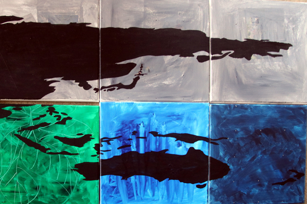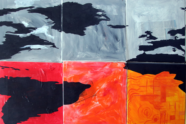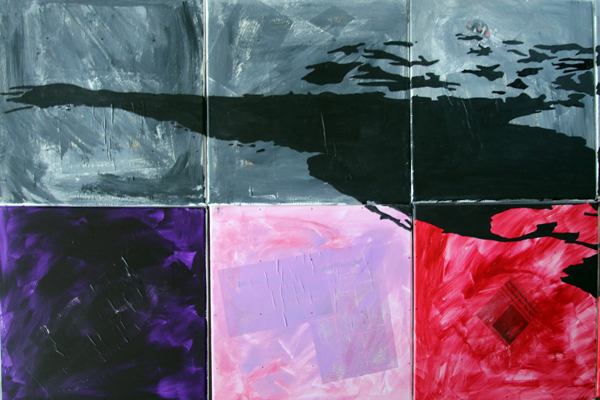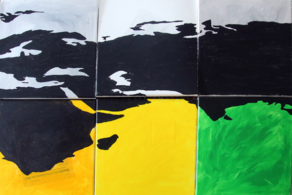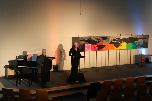 Ich habe auf 24 Leinwänden den einfachen Farbkreis in 12 Feldern und Graustufen von weiß bis schwarz als Untergrund gewählt und darauf die Silhouette der Welt gemalt. Vom Publikumsraum her ist das zu erkennen. Einzelne Leinwände sind abstrakt und strahlen ihre eigene Atmosphäre aus. Ich möchte mit den Farben ausdrücken, dass es bei allem Schrecklichen, was sich uns in Reportagen und Nachrichten eröffnet, doch auch immer wieder Hoffnungsschimmer gibt, bunte Oasen der Rettung. Ich habe mit Bedacht die sw.-weiss Palette nach oben in die westliche Welt gemalt. Meine Betonung liegt ein wenig pessimistisch darauf, dass wir westlichen Menschen die Erde leider sehr gefährdet haben. In den sogenannten Entwicklungsländern ist noch mehr Farbe und Fröhlichkeit vorhanden. Aber das kann man natürlich auch genau andersherum interpretieren. Die Verwüstungen durch Kriege, Diktatoren, Rassenkämpfe und Mülltourismuss ist dort viel verheerender als bei uns. Ich möchte mit dem Gesamtwerk darauf hinweisen, dass man das Ganze nicht aus den Augen verlieren darf. Gerne konzentrieren wir uns auf einen Ausschnitt. Das reicht nicht. Es ist nur ein Anfang um gemachte Fehler zu beheben.