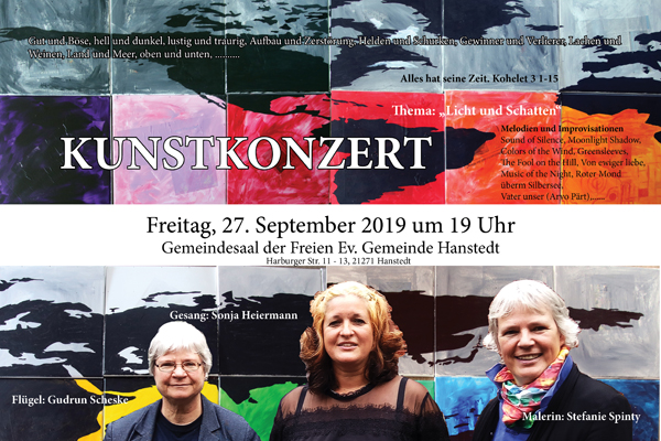 Im September 2019 hat das Kunstnetz-Jesteburg eine zweite Ausstellung zum Thema "Licht und Schatten" organisiert. Frau Spinty hat 24 Leinwände zu einer Gesamtcollage verarbeitet. Die Vorgaben für das Kunstkonzert waren, 12 Farben, 12 Grautöne. Die Künstlerin entschied sich dafür, die Weltkugel linear darzustellen und alle Kontinente auf zweimal 12 Leinwände à 40x40cm zu malen.